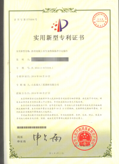 • 混凝土攪拌運輸車實用新型專利證書